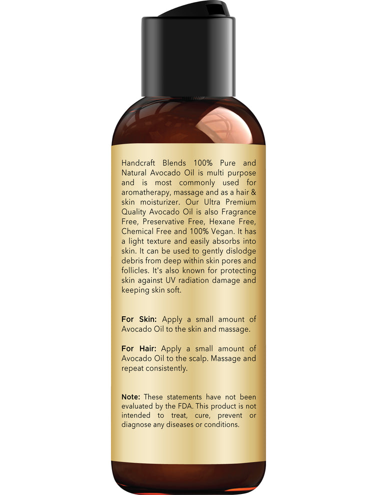 Handcraft Blends Avocado Oil - Cold-Pressed 4 Fl Oz - 100% Pure and Natural - Premium Grade Carrier Oil for Skin and Hair - Hair and Body - Massage - Hexane-Free