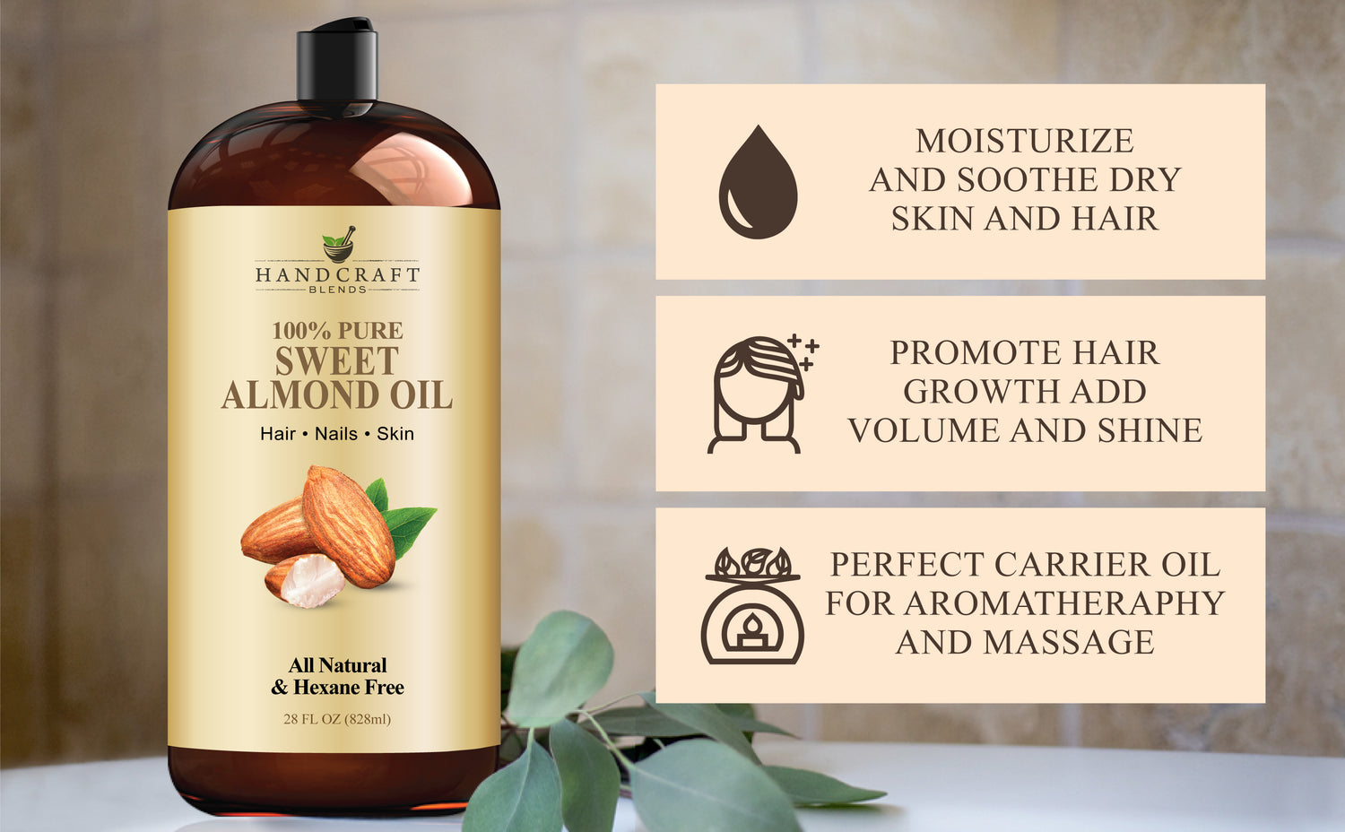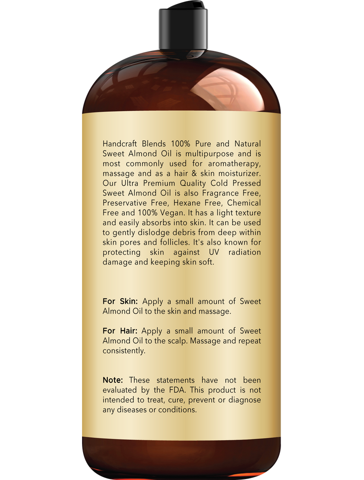 - 100% PURE & NATURAL SWEET ALMOND OIL is most used for aromatherapy, massage therapy and as a hair and skin moisturizer. Our almond oil is Fragrance Free, Hexane Free, Preservative Free, Chemical Free and 100% Vegan.