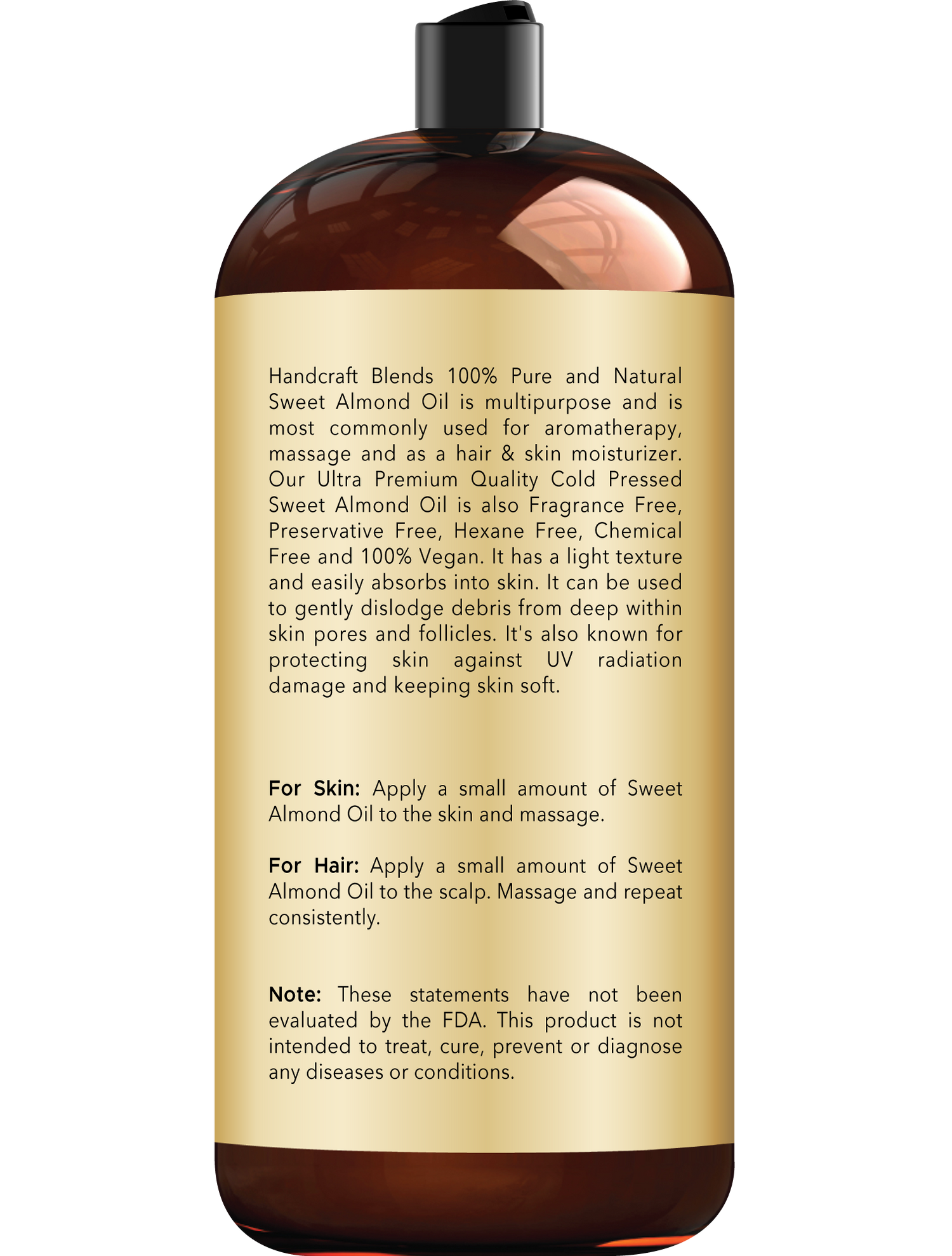 Handcraft Blends Sweet Almond Oil - 28 Fl Oz - 100% Pure and Natural - Premium Grade Carrier Oil for Skin and Hair - Hair and Body - Massage - Hexane-Free