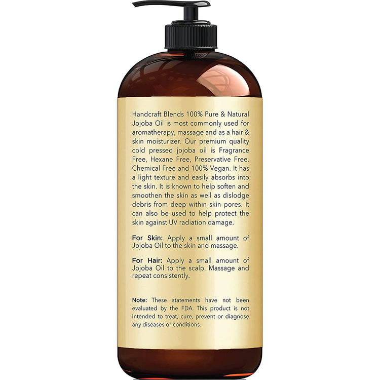 - COLD PRESSED NATURAL JOJOBA OIL - Our pure jojoba oil is extracted from the jojoba seeds using cold pressed extraction method. It is most used for aromatherapy, massage and as a hair and skin moisturizer. Our premium quality jojoba carrier oil is hexane free, preservative free, chemical free and 100% vegan.