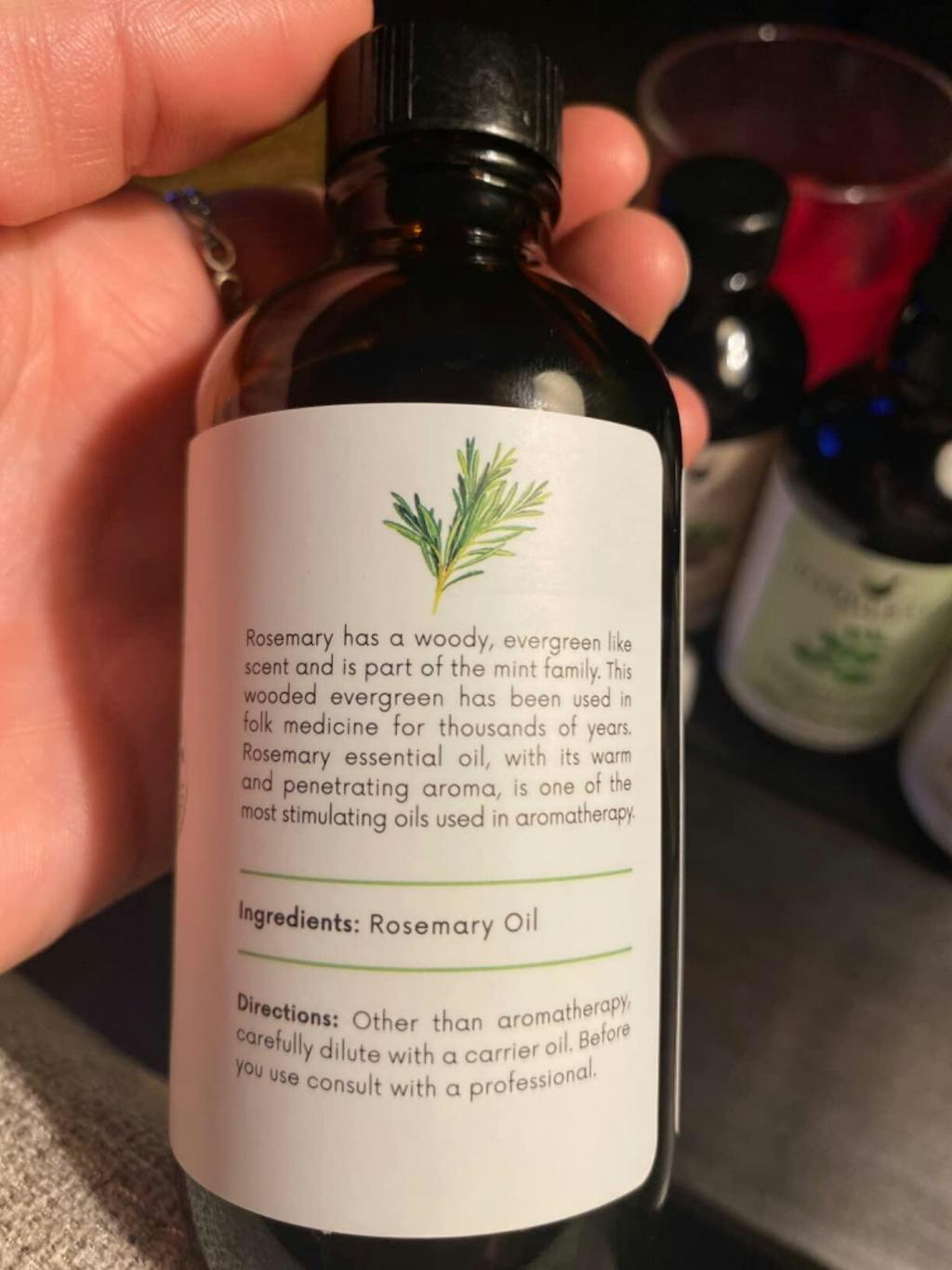 Warning: For external use only. Rosemary essential oil must be diluted before applying to the skin or scalp. Avoid contact with eyes and sensitive areas. Perform a patch test before first use and discontinue if irritation occurs. Keep out of reach of children and pets.